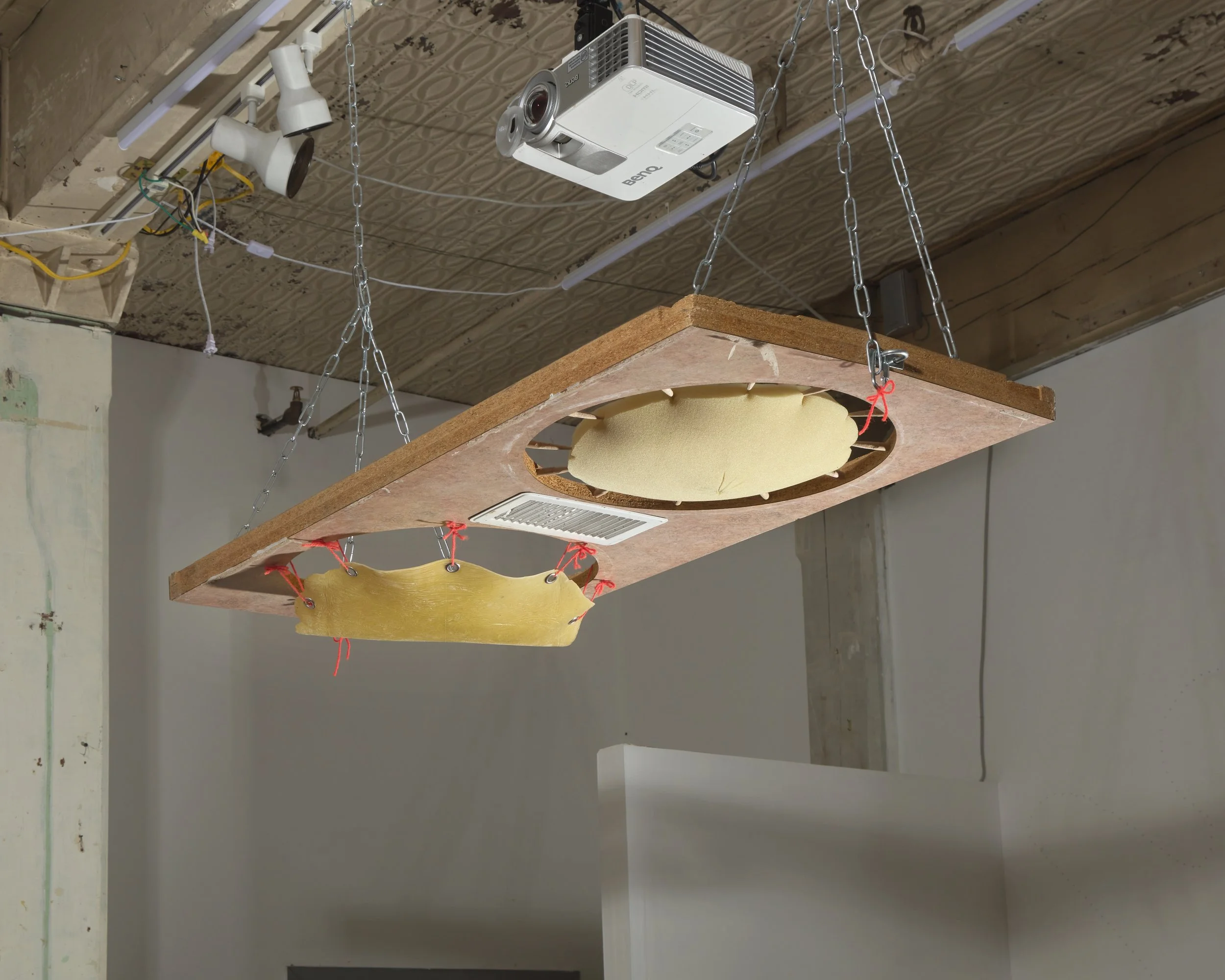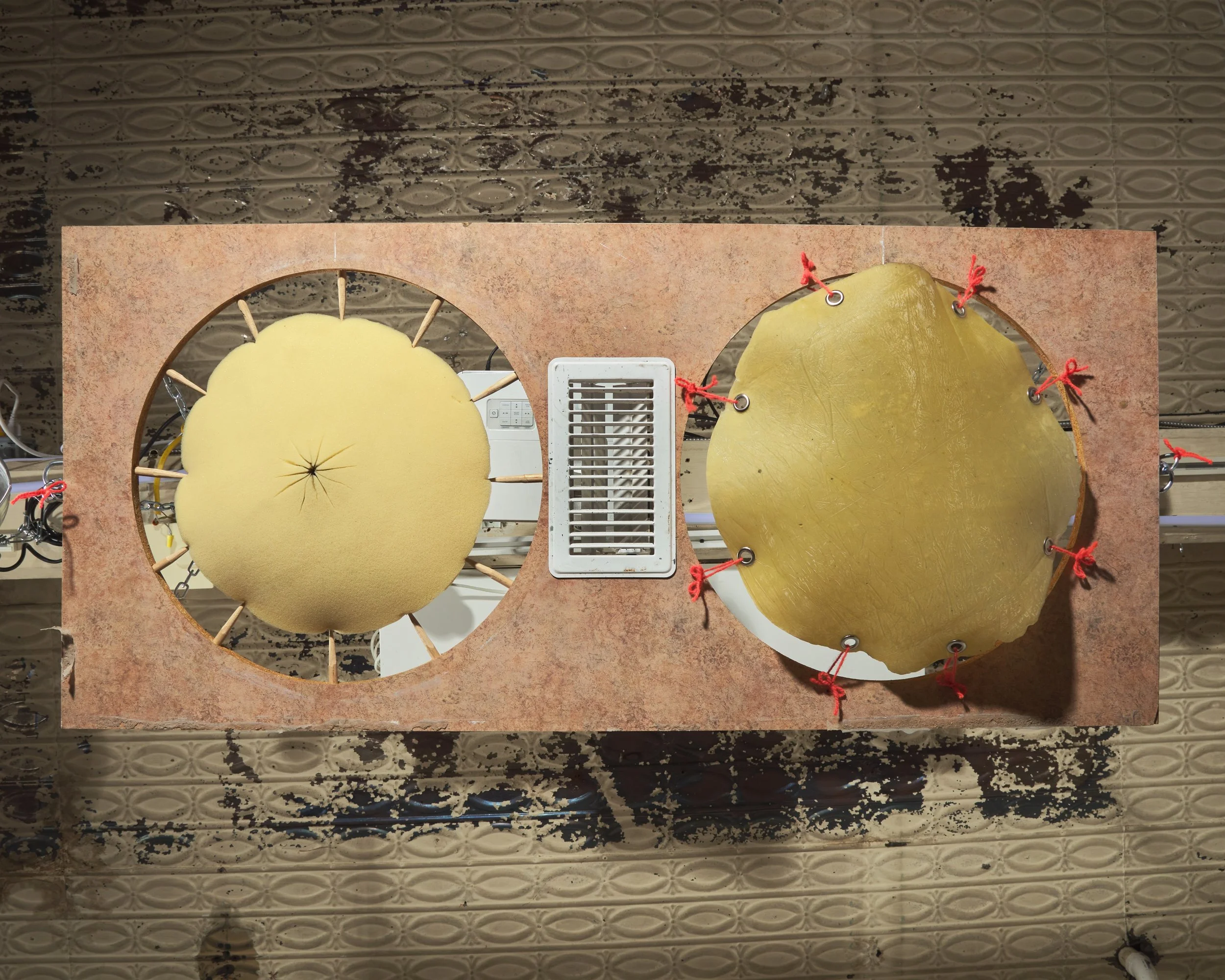 Drop Ceiling, 2025. 48”x22”x5”, sink counter, pine, yellow foam, air vent, liquid latex, grommets, Pennsylvanian yarn.
